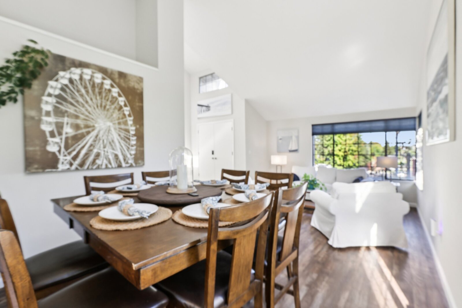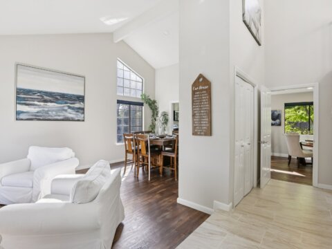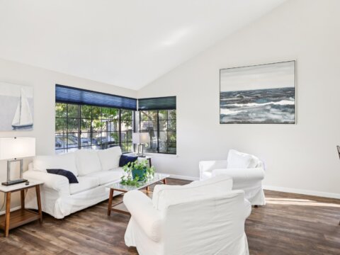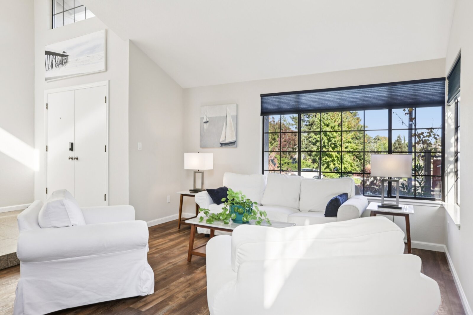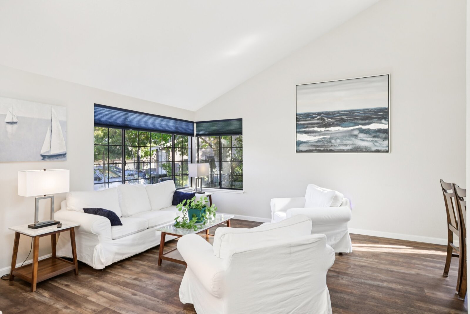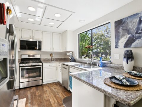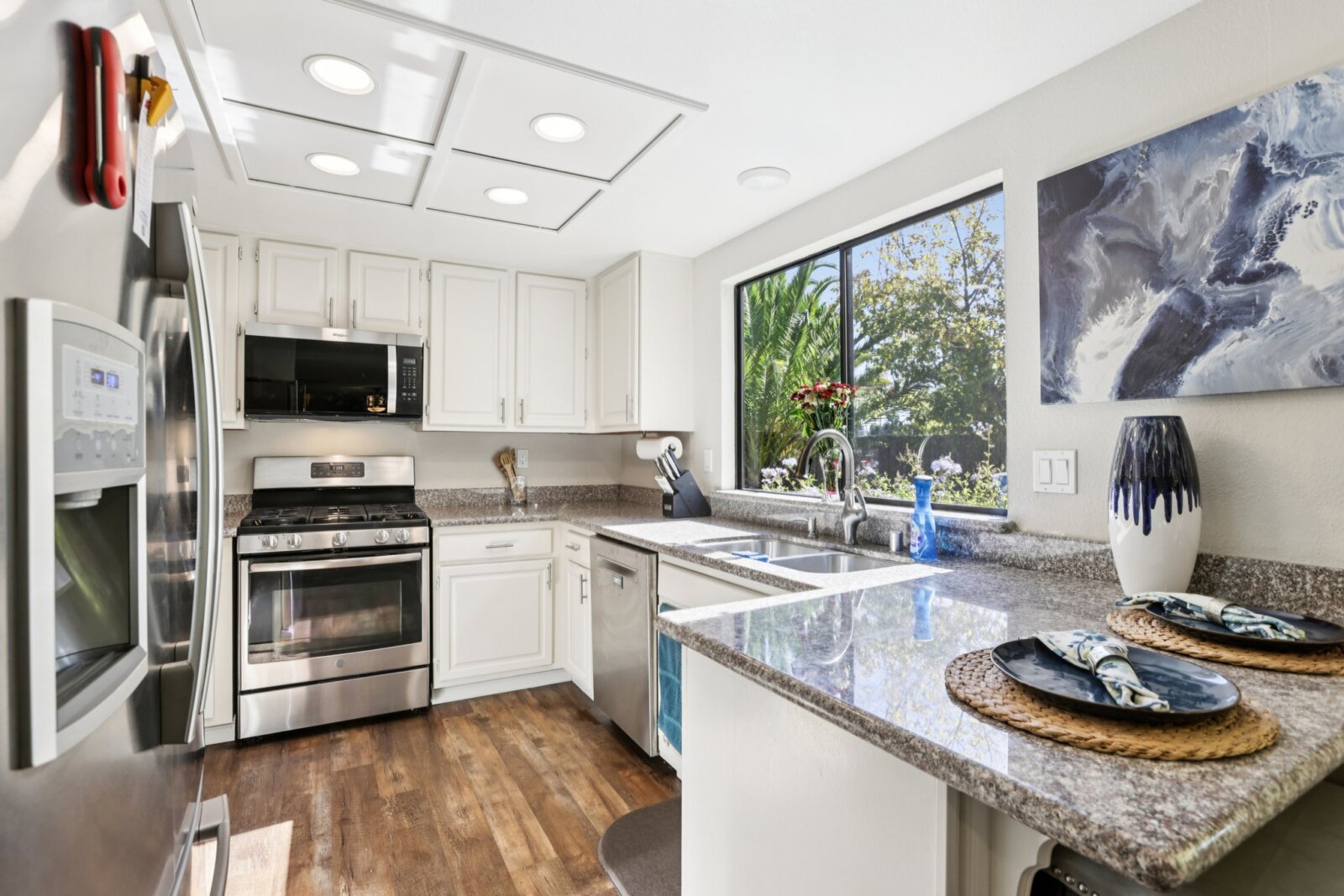 Tasteful updates throughout with newly remodeled bathrooms, LVP waterproof flooring, tiled entry, recessed lighting throughout, new paint, new hot water heater and much more! Nice kitchen with granite countertops and stainless steel appliances including a 5 burner gas range.With vaulted ceilings, large windows, custom shades and a functional layout that maximizes every space.